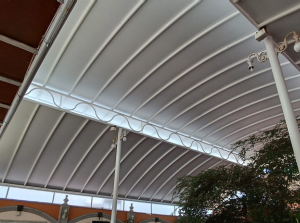 Sistema de cubierta arquitectónica conformado por estructura metálica de acero pintado y lona BLOCK OUT de 21 oz. Su diseño está concebido para garantizar impermeabilidad total, resistencia a la intemperie y larga vida útil en aplicaciones exteriores.