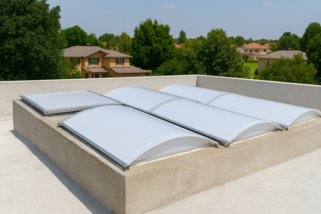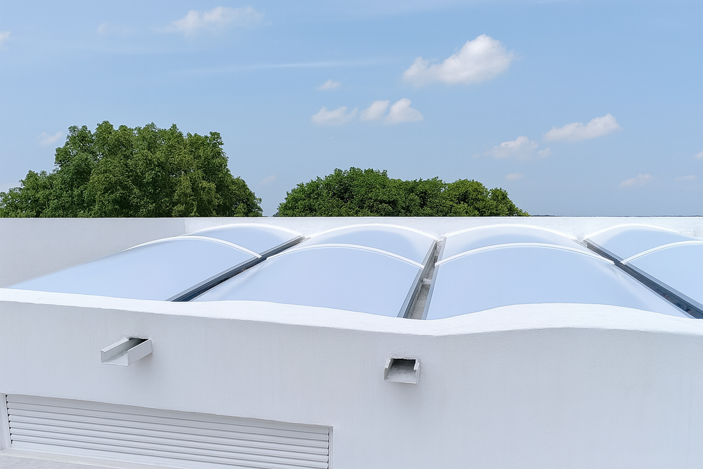 Sistema de domo modular curvo diseñado para instalación en azoteas o cubiertas planas, compuesto por paneles de policarbonato celular blanco traslúcido, montados sobre una resistente estructura de aluminio con perfiles especialmente diseñados para permitir ventilación, desagüe y acceso técnico. Este sistema integra canales recolectores de agua pluvial y una escotilla abatible para mantenimiento o acceso a la azotea.