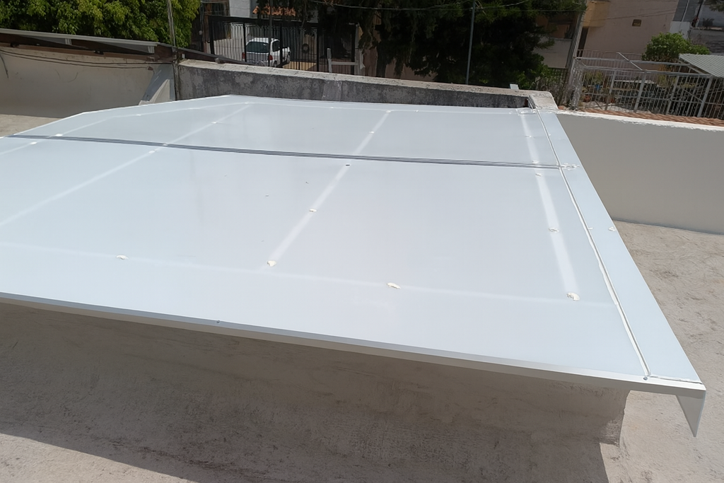 Sistema de cubierta ligera conformado por lámina de policarbonato en color blanco con protección UV, soportada sobre estructura de acero pintado anticorrosivo y fijada mediante perfiles de aluminio anodizado. Diseñada para instalación en fachadas, accesos y balcones, ofreciendo una solución estética y funcional.