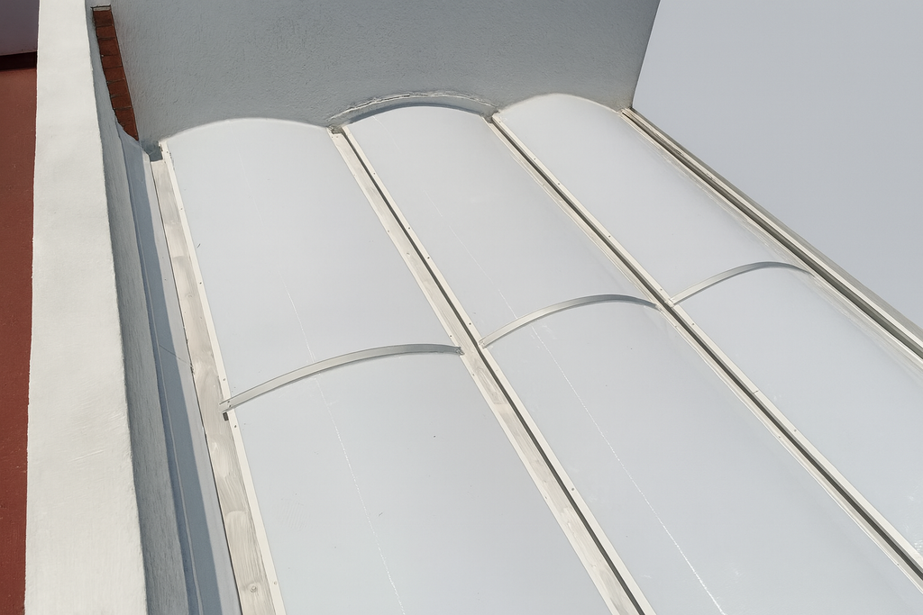 Sistema de cubierta plana ligera en policarbonato celular traslúcido con protección UV, instalado sobre estructura metálica de acero con acabado anticorrosivo y sellada mediante perfiles de aluminio anodizado. Diseñada para garantizar resistencia estructural y hermeticidad, brindando iluminación natural y protección contra la intemperie.