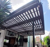 Sistema de cubierta tipo pérgola diseñado para proporcionar sombra y confort térmico en áreas exteriores. Fabricada en acero estructural con acabado anticorrosivo y lamas fijas metálicas orientadas para permitir la circulación del aire y el paso controlado de luz natural. Su diseño moderno se integra con espacios residenciales y comerciales, aportando funcionalidad y estética arquitectónica.
