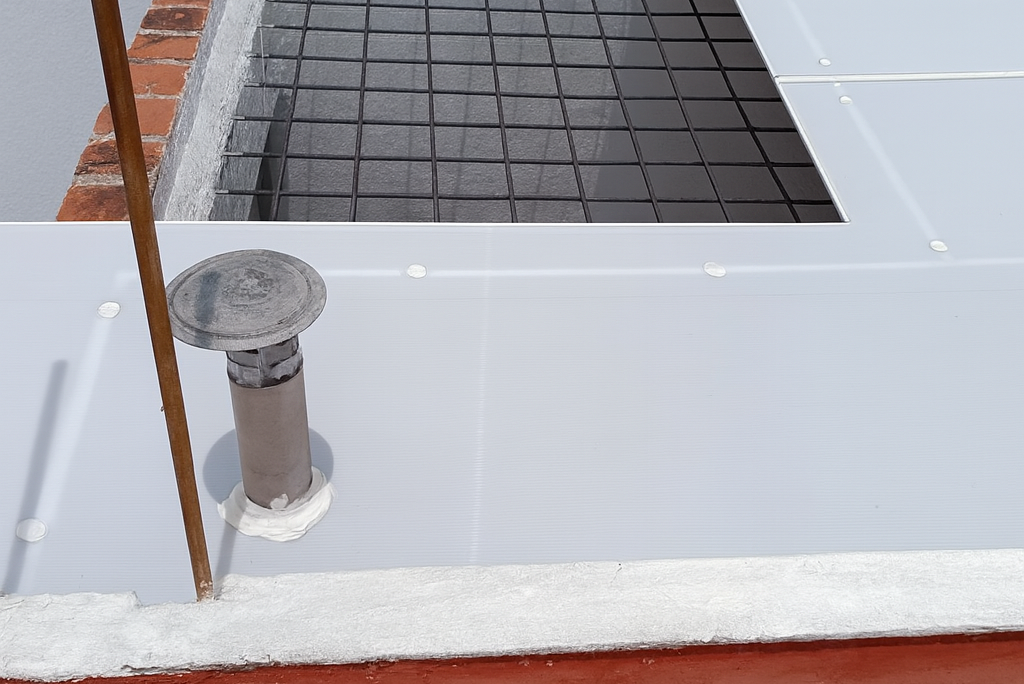 Sistema de cubierta plana ligera en policarbonato traslúcido con protección UV, instalado sobre estructura y perfiles de aluminio anodizado. Incluye un marco superior de aluminio en el cual se integra malla sombra, diseñada para mitigar el ruido de la lluvia y amortiguar el impacto del granizo.