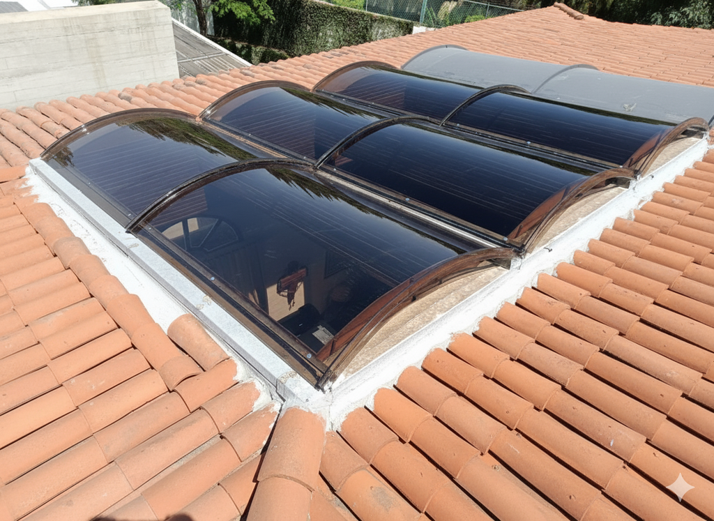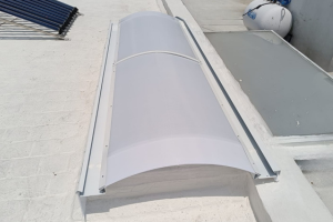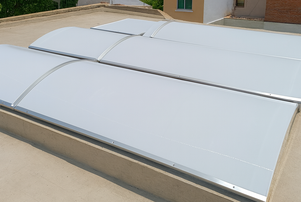 Sistema de domo corredizo con cubierta curva, diseñado para permitir ventilación natural, acceso y entrada de luz. Fabricado en policarbonato traslúcido con filtro UV, montado sobre estructura de acero estructural con acabado anticorrosivo y perfiles de aluminio anodizado que aseguran una fijación hermética y de bajo mantenimiento.
