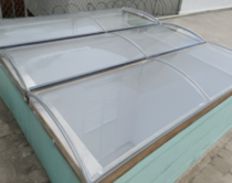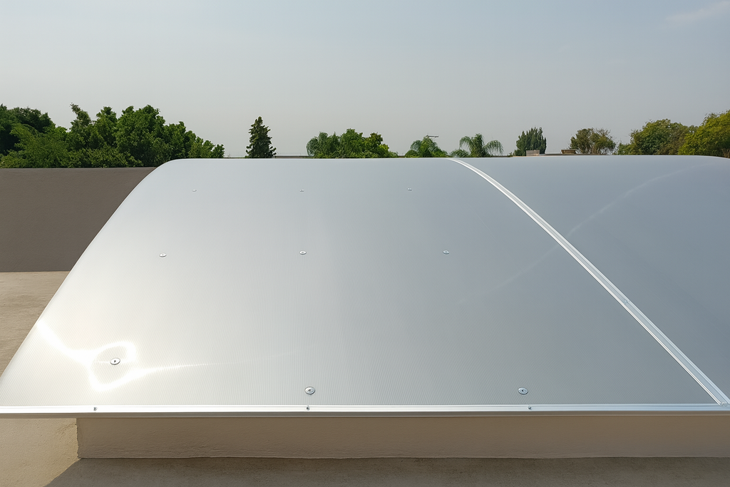 Domo arquitectónico fabricado con paneles de policarbonato celular translúcido, diseñado para proporcionar iluminación natural controlada y protección contra las inclemencias del tiempo. Su estructura combina perfiles de aluminio con refuerzos de acero estructural, garantizando alta resistencia mecánica, durabilidad y un acabado estético de alta calidad.