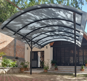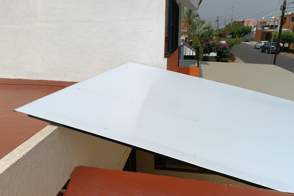 Sistema de cubierta ligera conformado por lámina de policarbonato en color blanco con protección UV, soportada sobre estructura de acero pintado anticorrosivo y fijada mediante perfiles de aluminio anodizado. Diseñada para instalación en fachadas, accesos y balcones, ofreciendo una solución estética y funcional.