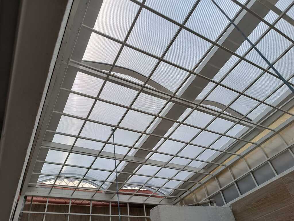 Sistema de cubierta plana fabricado con paneles de policarbonato celular de alta resistencia, montados sobre una estructura de perfiles de aluminio especialmente diseñados para garantizar estanqueidad, durabilidad y un acabado limpio y profesional. Ideal para zonas de servicio, cubiertas de patios, tragaluces o protecciones superiores donde se requiera iluminación natural y resistencia estructural.