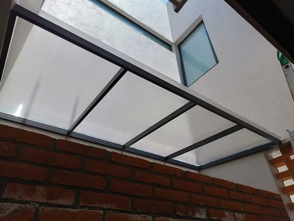 Sistema de cubierta ligera conformada por lámina de policarbonato celular traslúcido con protección UV, instalada sobre estructura metálica de acero pintado anticorrosivo. Su diseño plano con pendiente mínima garantiza un adecuado desalojo pluvial y aporta iluminación natural en áreas residenciales o comerciales.