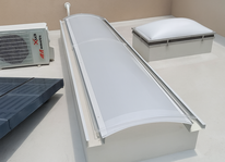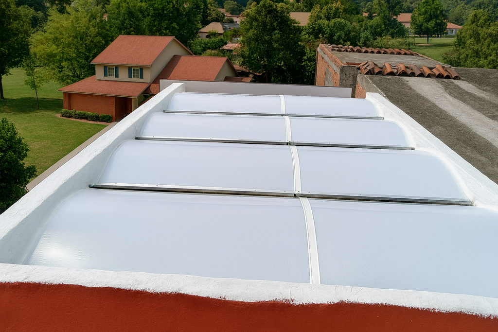 Sistema de domo modular curvo diseñado para instalación en azoteas o cubiertas planas, compuesto por paneles de policarbonato celular blanco traslúcido, montados sobre una resistente estructura de aluminio con perfiles especialmente diseñados para permitir ventilación, desagüe y acceso técnico. Este sistema integra canales recolectores de agua pluvial y una escotilla abatible para mantenimiento o acceso a la azotea.