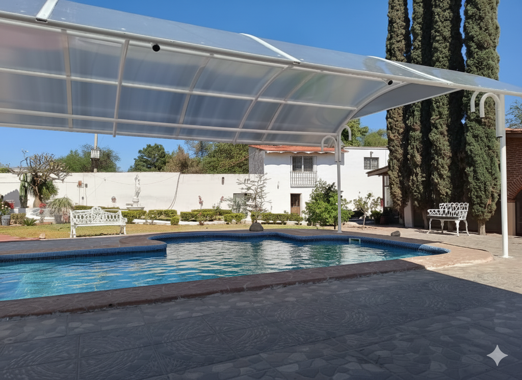 Sistema de cubierta curva en policarbonato traslúcido con filtro UV, montado sobre estructura metálica de acero pintado. Diseñada para resistir la intemperie y brindar protección contra los rayos solares, manteniendo iluminación natural en el área de alberca.