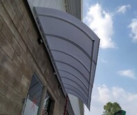 Sistema de marquesina curva diseñado para proteger accesos y ventanas, fabricado en policarbonato traslúcido con filtro UV, instalado sobre estructura de acero estructural con acabado anticorrosivo. Los perfiles de aluminio brindan una fijación estética y duradera, garantizando protección contra lluvia y radiación solar, además de un diseño moderno que complementa fachadas industriales y comerciales.